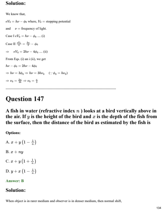 A fish in water (refractive index \( n \)) looks at a bird vertically above in the air. If \( y \) is the height of the bird and \( z \) is the depth of the fish from the surface, then the distance of the bird as estimated by the fish is