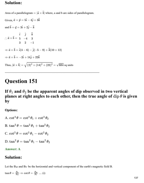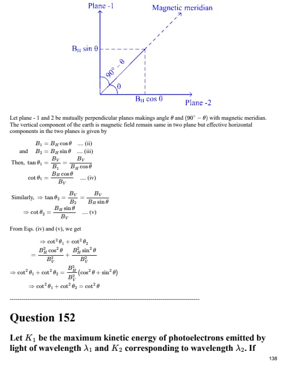 If \( \theta_1 \) and \( \theta_2 \) be the apparent angles of dip observed in two vertical planes at right angles to each other, then the true angle of dip \( \theta \) is given by