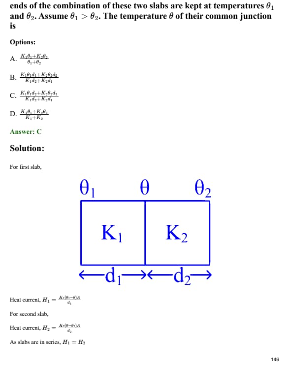 Two slabs are of the thicknesses \( d_1 \) and \( d_2 \). Their thermal conductivities are \( K_1 \) and \( K_2 \), respectively. They are in series. The free ends of the combination of these two slabs are kept at temperatures \( \theta_1 \) and \( \theta_2 \). Assume \( \theta_1 > \theta_2 \). The temperature \( \theta \) of their common junction is