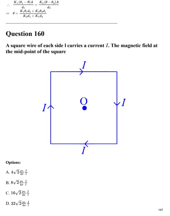 A square wire of each side \( l \) carries a current \( I \). The magnetic field at the mid-point of the square