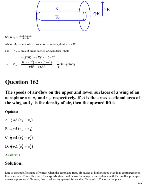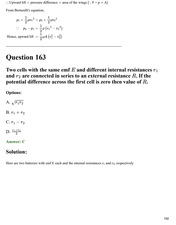 The speeds of air-flow on the upper and lower surfaces of a wing of an aeroplane are \( v_1 \) and \( v_2 \), respectively. If \( A \) is the cross-sectional area of the wing and \( \rho \) is the density of air, then the upward lift is