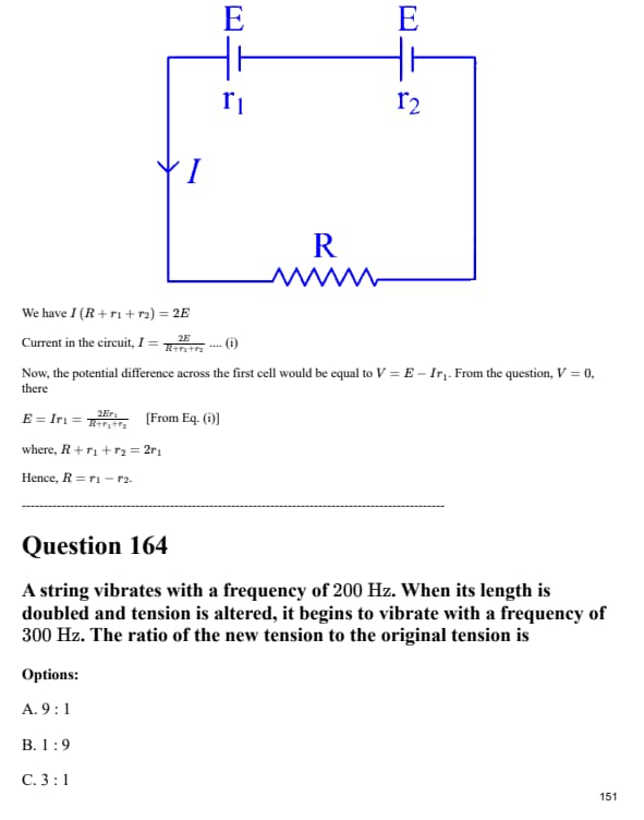 Two cells with the same emf \( E \) and different internal resistances \( r_1 \) and \( r_2 \) are connected in series to an external resistance \( R \). If the potential difference across the first cell is zero then the value of \( R \) is