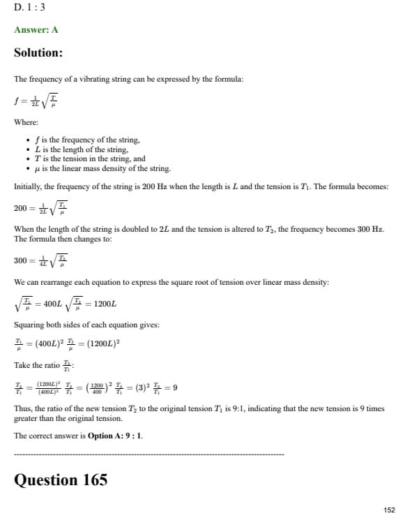 A string vibrates with a frequency of 200 Hz. When its length is doubled and tension is altered, it begins to vibrate with a frequency of 300 Hz. The ratio of the new tension to the original tension is
