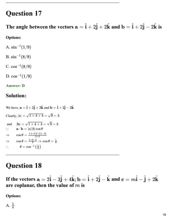 The angle between the vectors \[ a = \hat{i} + 2 \hat{j} + 2 \hat{k} \quad and \quad b = \hat{i} + 2 \hat{j} - 2 \hat{k} \quad is \]