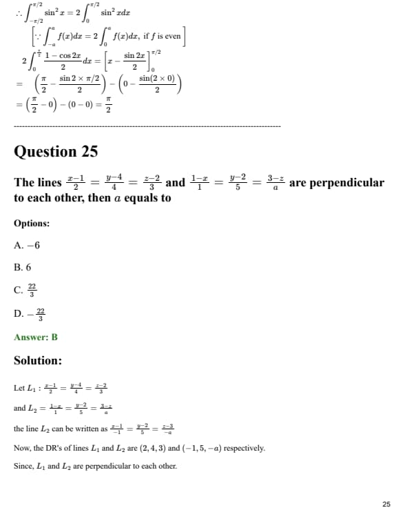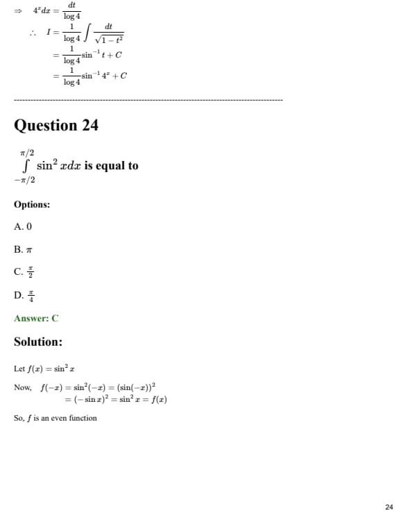 The integral ∫−π/2π/2 sin²(x) dx is equal to