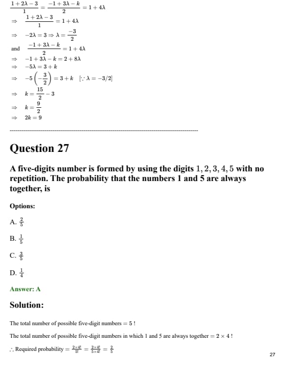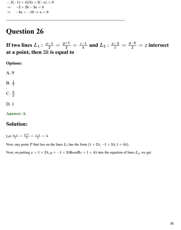If two lines \( L_1 : \frac{x-1}{2} = \frac{y+1}{3} = \frac{z-1}{4} \) and \( L_2 : \frac{x-3}{1} = \frac{y-k}{2} = z \) intersect at a point, then \( 2k \) is equal to