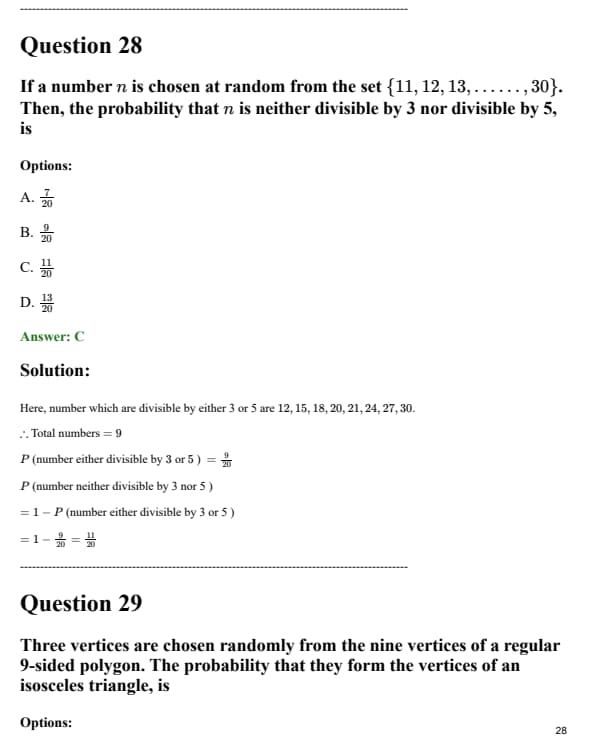 If a number n is chosen at random from the set {11, 12, 13, ..., 30}, then the probability that n is neither divisible by 3 nor divisible by 5 is