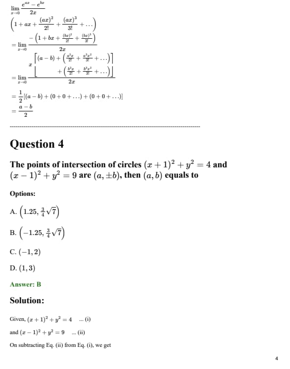 The points of intersection of circles (x + 1)2 + y2 = 4 and (x - 1)2 + y2 = 9 are (a, ± b), then (a, b) equals to