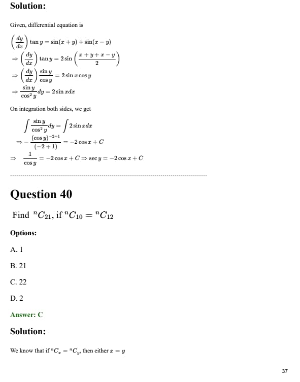 The solution of the differential equation \( \frac{dy}{dx} \tan y = \sin(x + y) + \sin(x - y) \) is