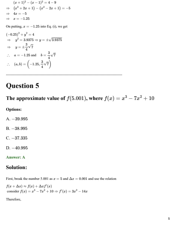 The approximate value of \( f(5.001) \), where \( f(x) = x^3 - 7x^2 + 10 \)