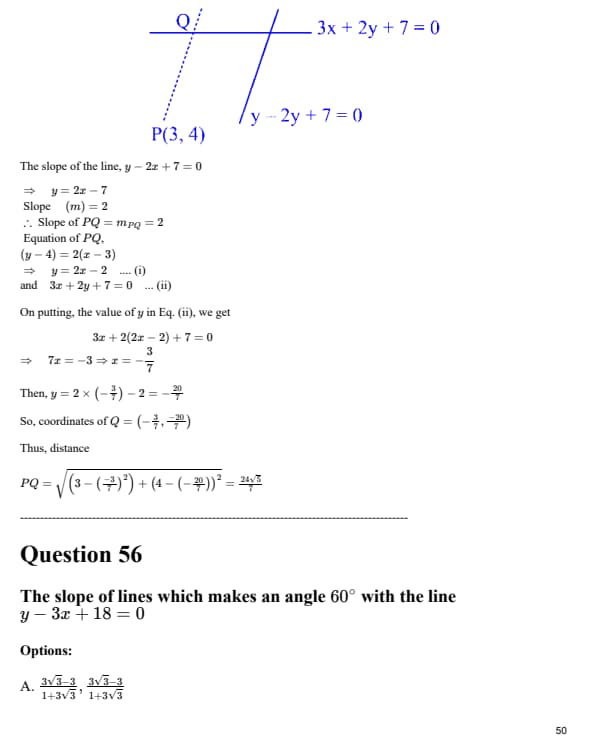 The distance of the point (3, 4) from the line \(3x + 2y + 7 = 0\) measured along the line parallel to \(y - 2x + 7 = 0\) is equal to