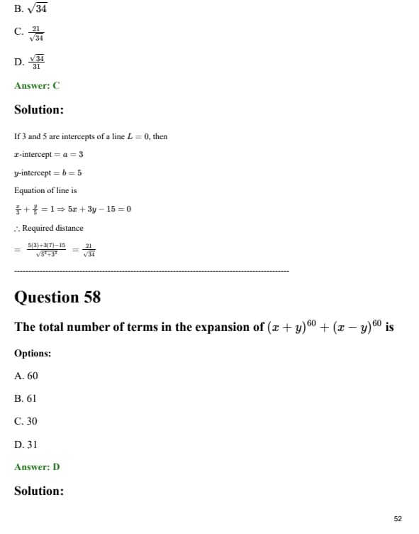 3 and 5 are intercepts of a line \(L = 0\), then the distance of \(L = 0\) from \((3, 7)\) is
