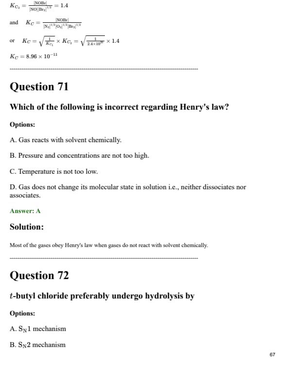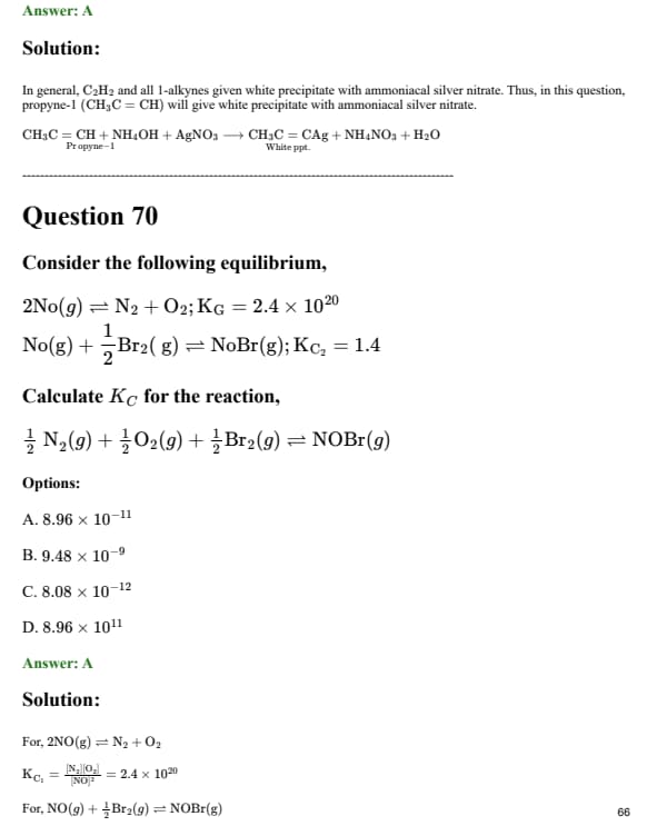 Consider the following equilibrium, \[ 2 NO(g) \rightleftharpoons N_2 (g) + O_2 (g); K_1 = 2.4 \times 10^{20} \] \[ NO(g) + \frac{1}{2} Br_2 (g) \rightleftharpoons NOBr(g); K_2 = 1.4 \]