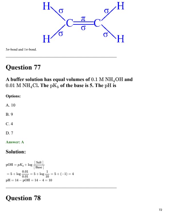 A buffer solution has equal volumes of 0.1 M NH\(_3\)OH and 0.01 M NH\(_4\)Cl. The pK\(_b\) of the base is 5. The pH is