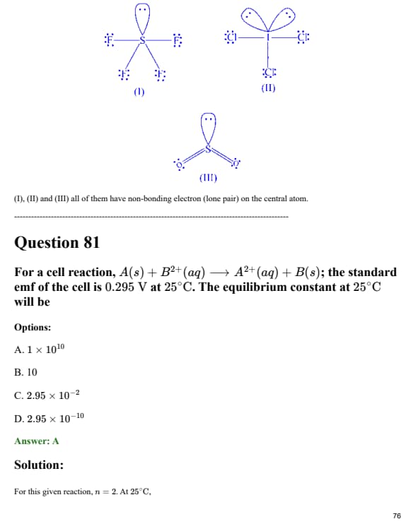 For a cell reaction, \( A(s) + B^{2+}(aq) \rightarrow A^{2+}(aq) + B(s) \); the standard emf of the cell is 0.295 V at 25°C. The equilibrium constant at 25°C will be