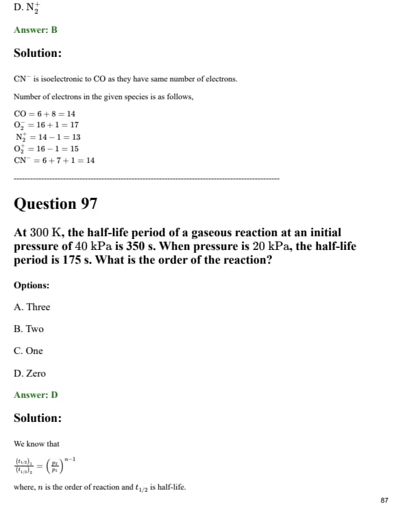 At 300 K, the half-life period of a gaseous reaction at an initial pressure of 40 kPa is 350 s. When pressure is 20 kPa, the half-life period is 175 s. What is the order of the reaction?