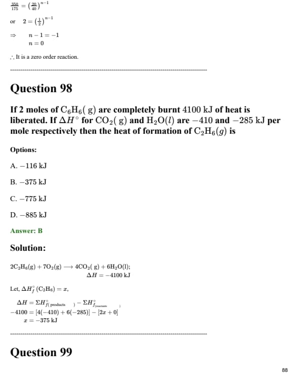 If 2 moles of \( C_6H_6 \) (g) are completely burnt 4100 kJ of heat is liberated. If \( \Delta H^\circ \) for \( CO_2 (g) \) and \( H_2O (l) \) are -410 kJ and -285 kJ per mole respectively then the heat of formation of \( C_6H_6 (g) \) is