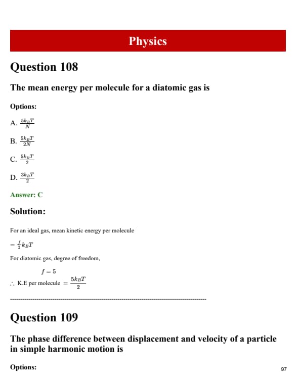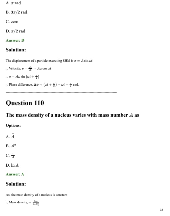 The phase difference between displacement and velocity of a particle in simple harmonic motion is