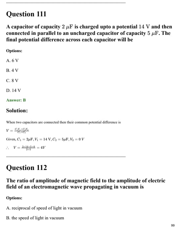 A capacitor of capacity 2 \( \mu F \) is charged up to a potential 14 V and then connected in parallel to an uncharged capacitor of capacity 5 \( \mu F \). The final potential difference across each capacitor will be