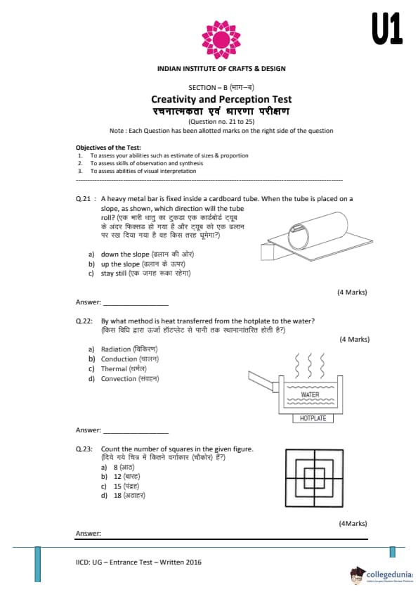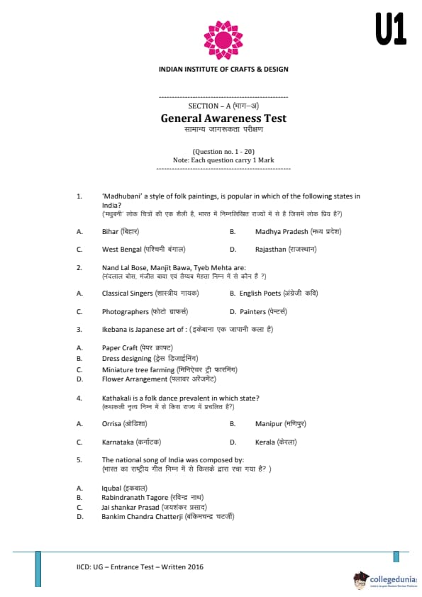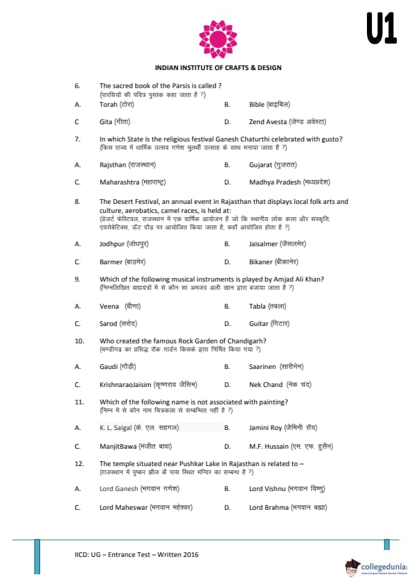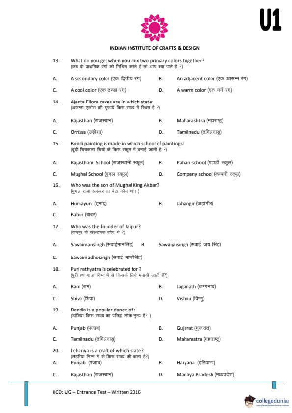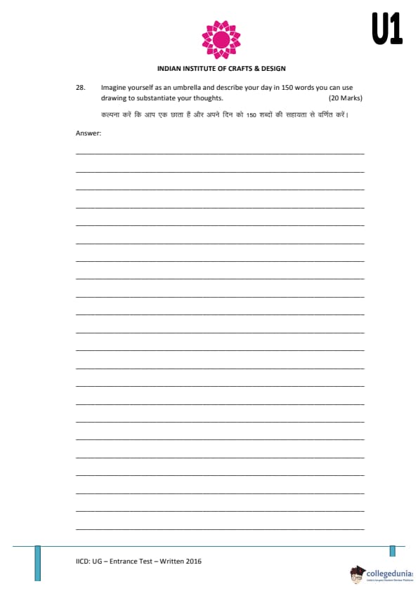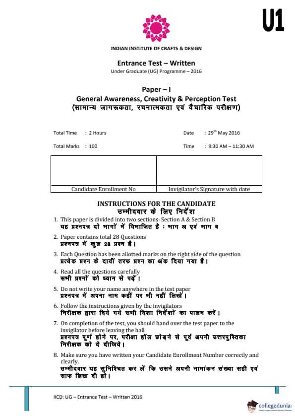 IICD 2016 UG General Awareness, Creativity and Perception Test Question paper with answer key pdf conducted on May 29, 2016 in Forenoon Session (9:30 AM to 11:30 AM) is available for download. The exam was successfully organized by Indian Institute of Crafts and Design, Jaipur. The question paper comprised a total of 28 questions.