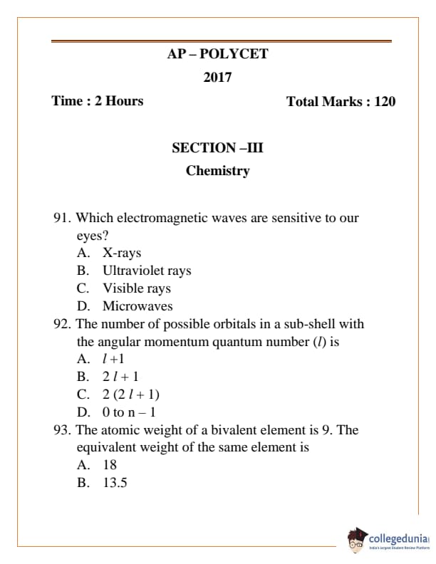 AP POLYCET 2017 Chemistry Question paper with answer key pdf conducted on April 28 is available for download. The exam was successfully organized by State Board of Technical Education & Training (SBTET), Andhra Pradesh. The question paper comprised a total of 30 questions.