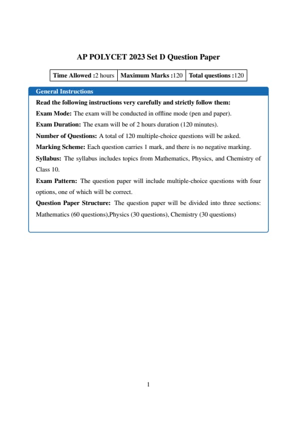 AP POLYCET 2023 Question Paper Set D is available for download here. AP POLYCET 2023 is going to be conducted on May 10 in a single shift. Candidates were asked 120 MCQs from Mathematics (60 questions), Physics (30 questions), and Chemistry (30 questions). A total duration of 120 minutes was given to the candidates to complete the AP POLYCET 2023 Question Paper.