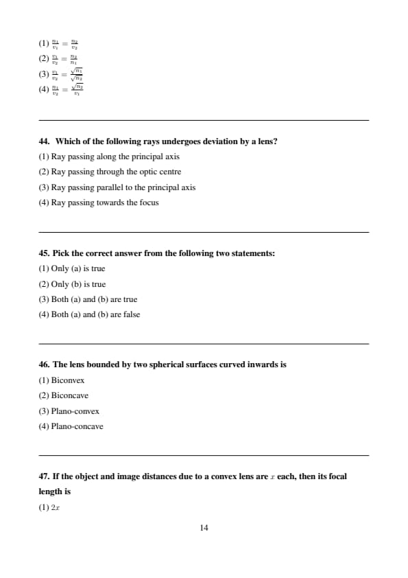 If \( v_1 \) and \( v_2 \) are the speeds of light in the two media of refractive indices \( n_1 \) and \( n_2 \) respectively, then: