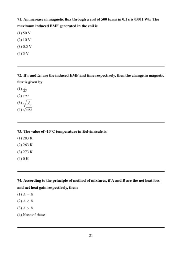 An increase in magnetic flux through a coil of 500 turns in 0.1 s is 0.001 Wb. The maximum induced EMF generated in the coil is
