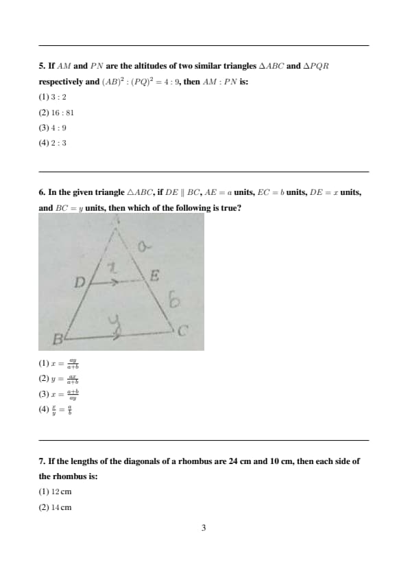 In the given triangle \( \triangle ABC \), if \( DE \parallel BC \), \( AE = a \) units, \( EC = b \) units, \( DE = x \) units, and \( BC = y \) units, then which of the following is true?