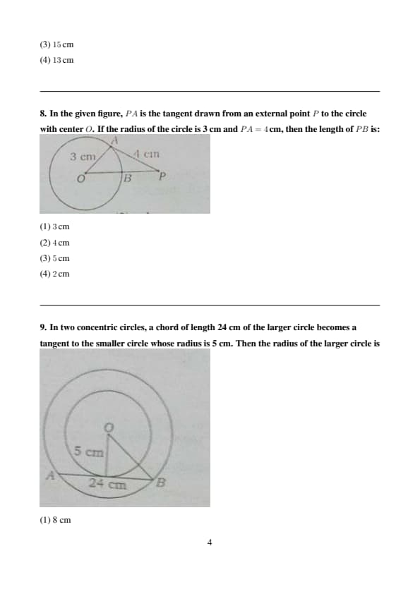 In the given figure, \( PA \) is the tangent drawn from an external point \( P \) to the circle with center \( O \). If the radius of the circle is 3 cm and \( PA = 4 \, cm \), then the length of \( PB \) is: