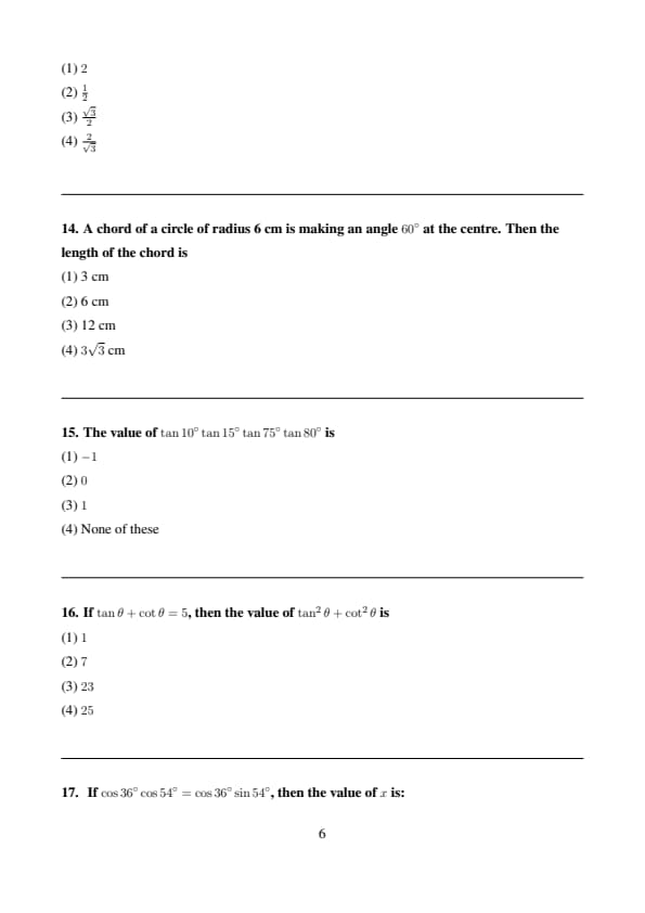 A chord of a circle of radius 6 cm is making an angle \( 60^\circ \) at the centre. Then the length of the chord is