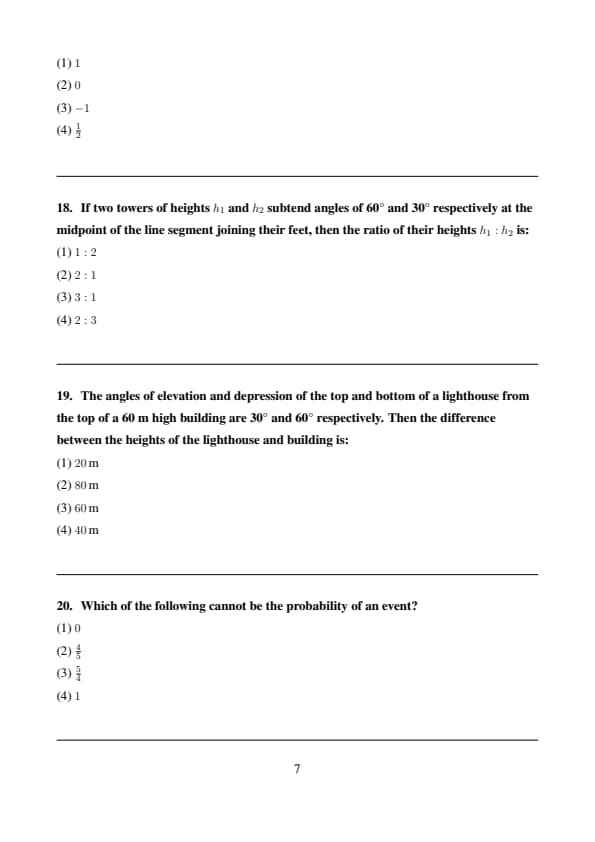 If two towers of heights \( h_1 \) and \( h_2 \) subtend angles of 60° and 30° respectively at the midpoint of the line segment joining their feet, then the ratio of their heights \( h_1 : h_2 \) is: