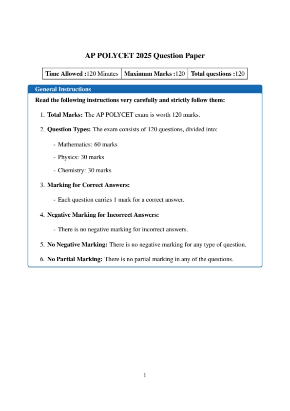 The AP POLYCET 2025 exam was held in offline PBT mode with a total of 120 MCQs divided between three subjects: Physics (40 questions), Chemistry (30 questions) and Mathematics (50 questions) to be completed in 120 minutes (2 hours) for a total of 120 marks. As per the AP POLYCET 2025 marking scheme, 1 mark is given for every correct answer, with no negative marking for incorrect answers.