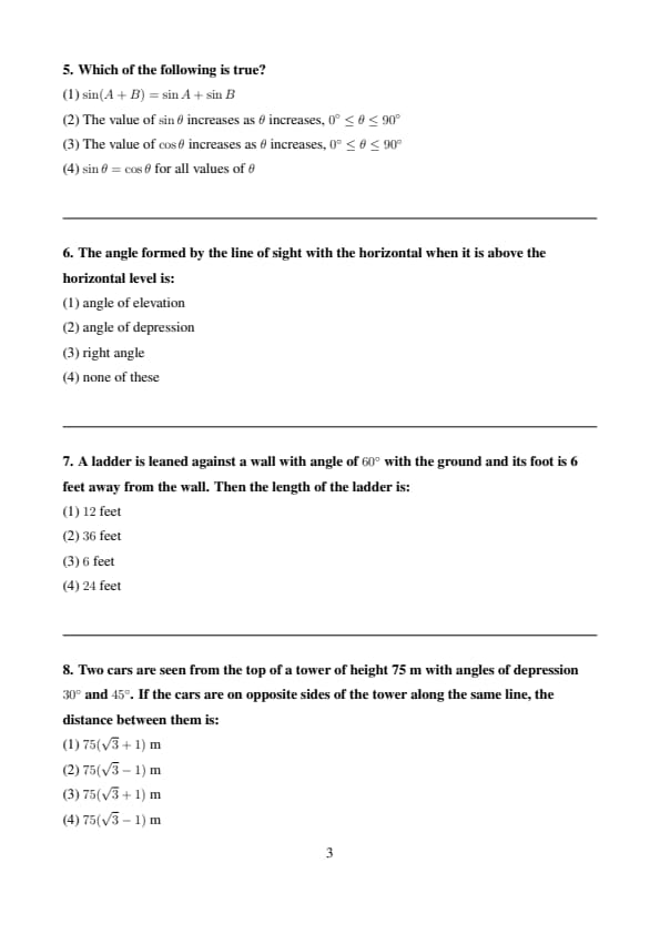 - (3) The value of \( \cos \theta \) increases as \( \theta \) increases, \( 0^\circ \leq \theta \leq 90^\circ \)