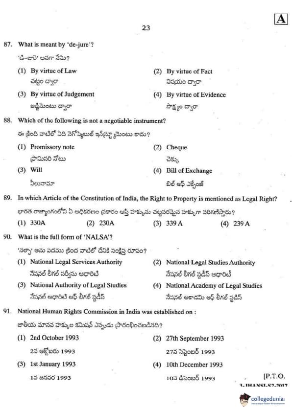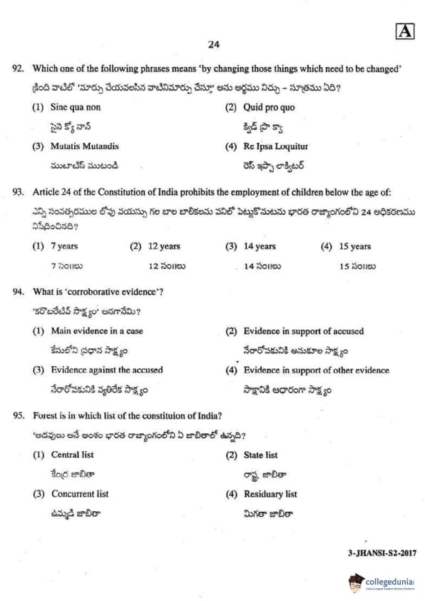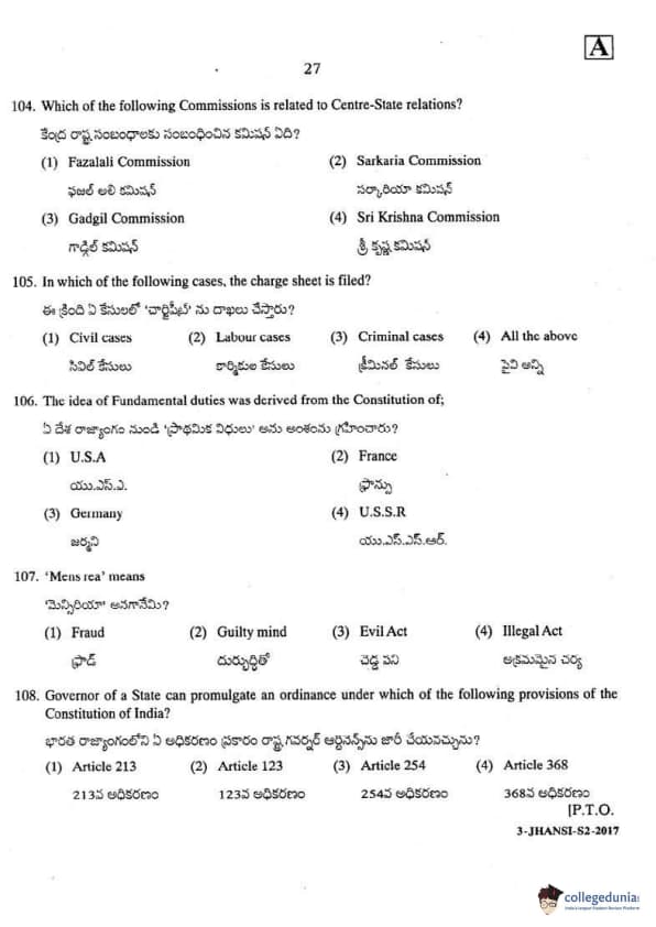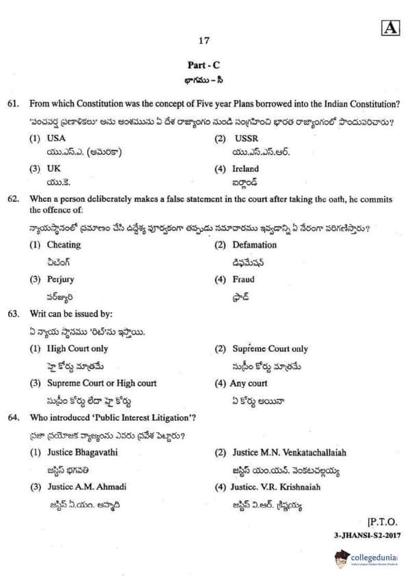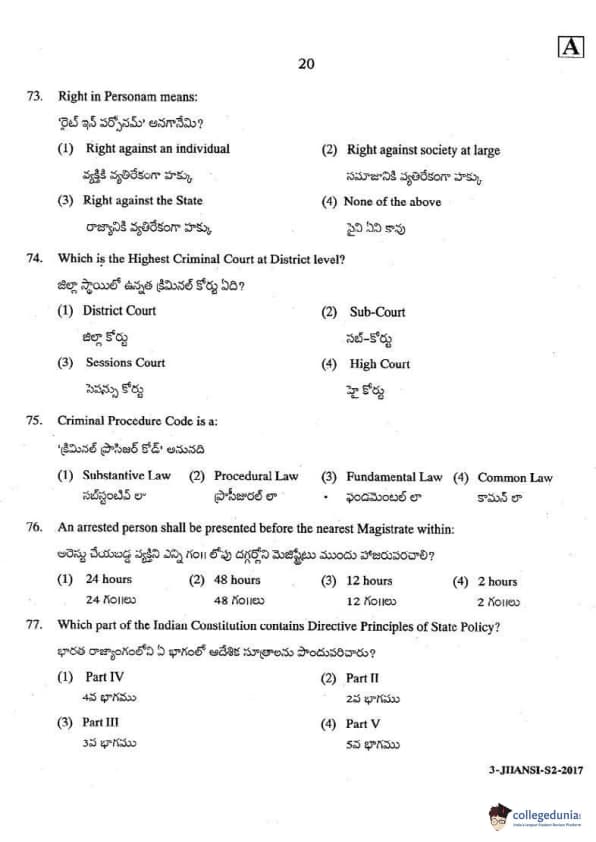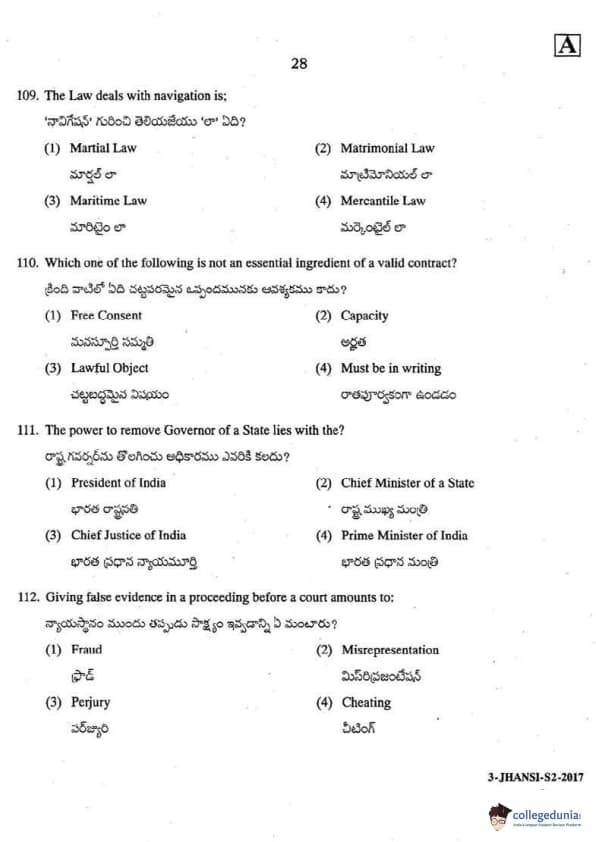 TS PGLCET 2017 LLM Question Paper with Answer Key PDF