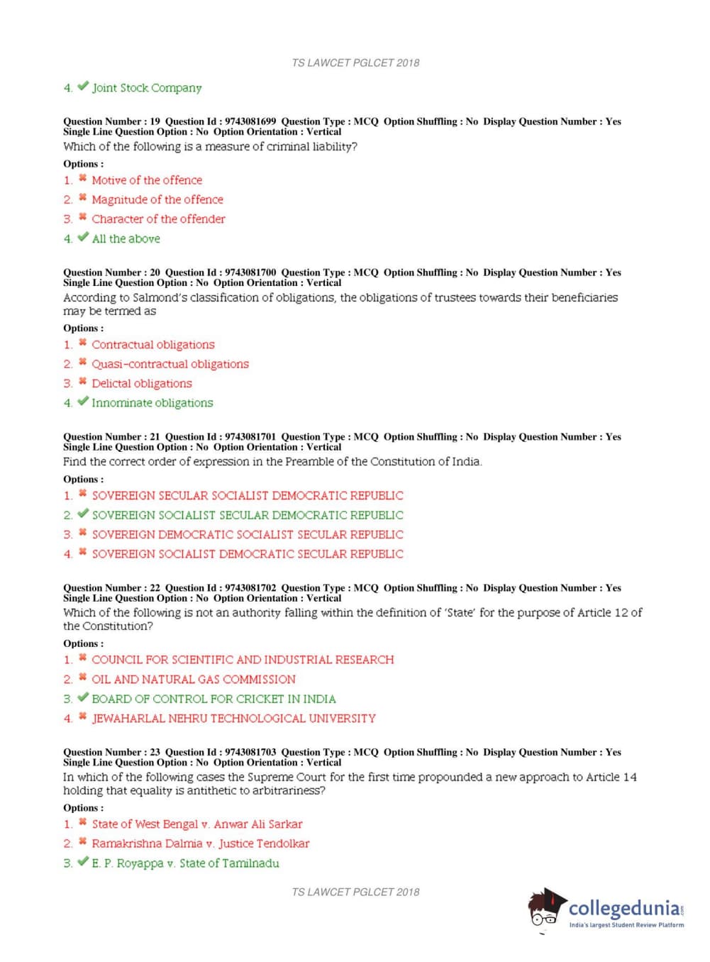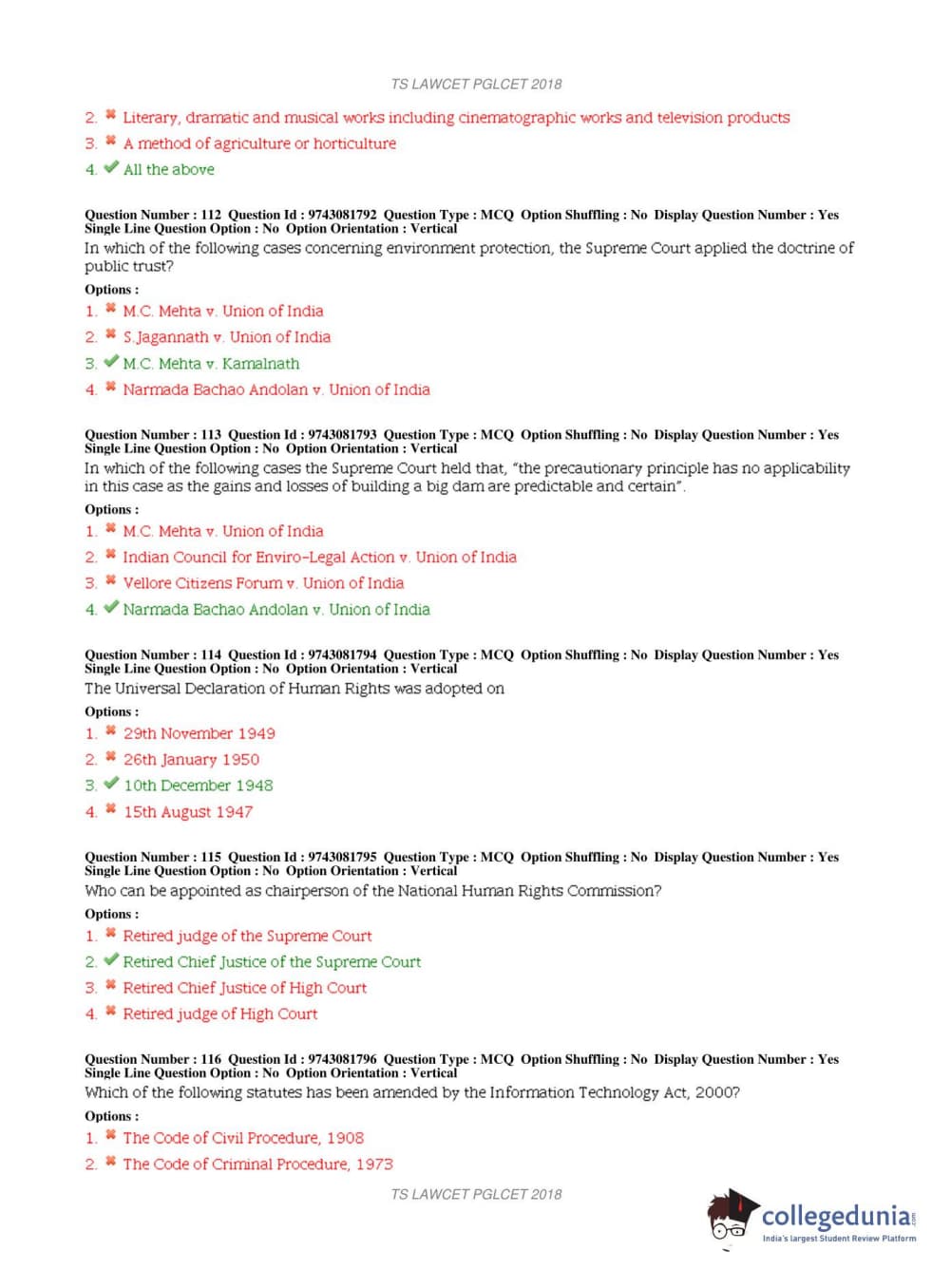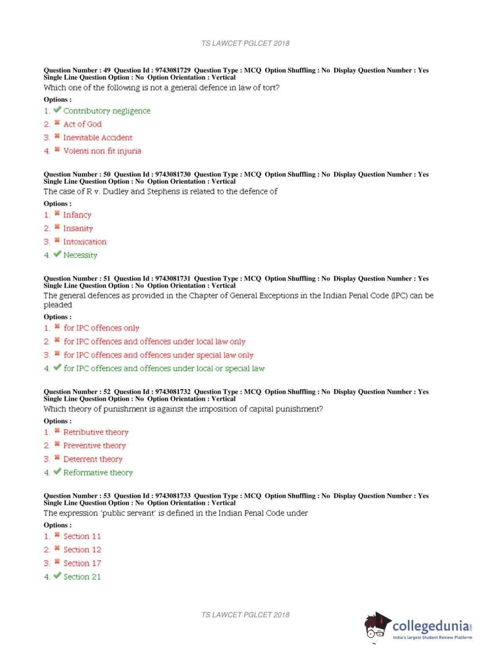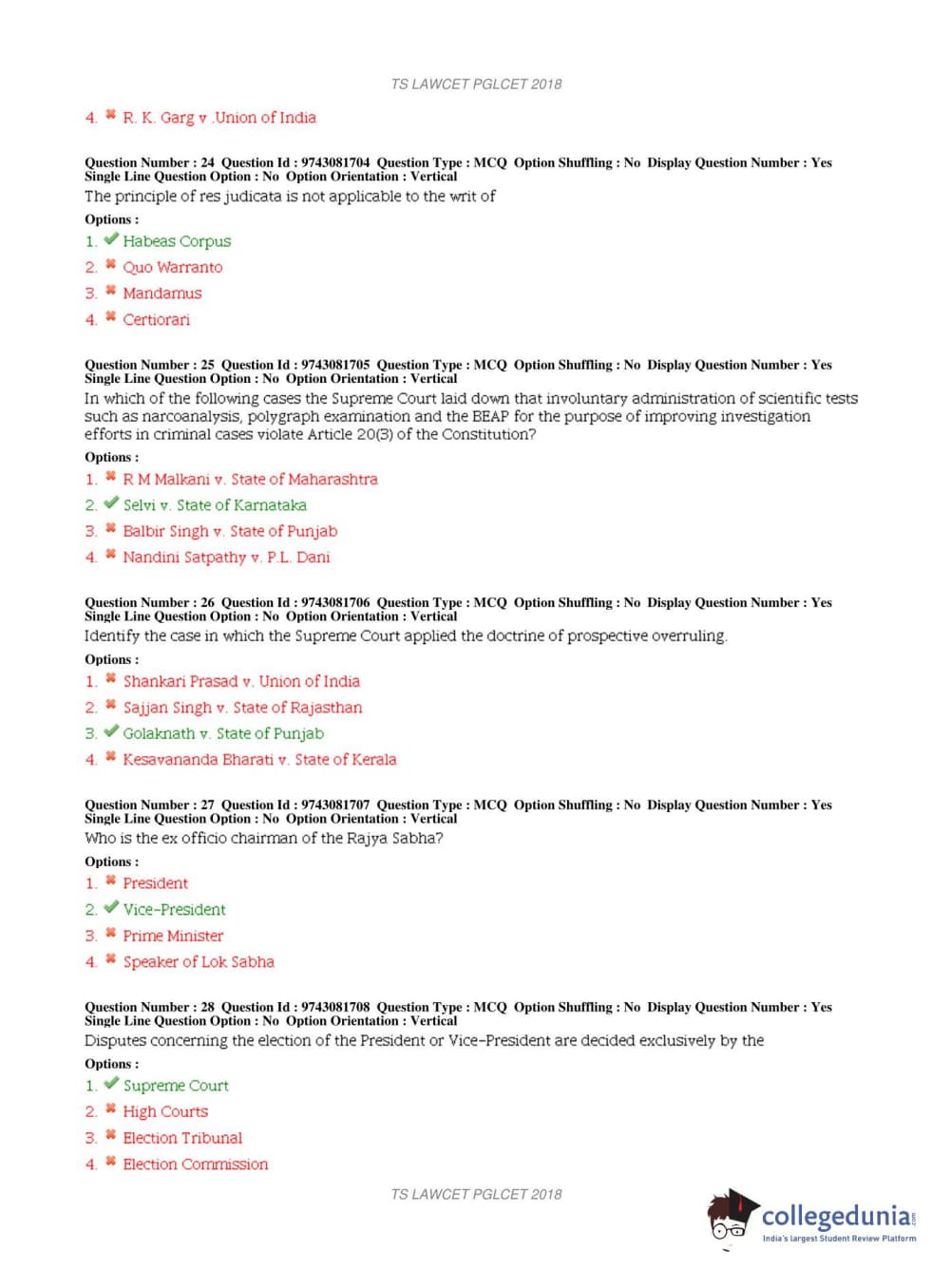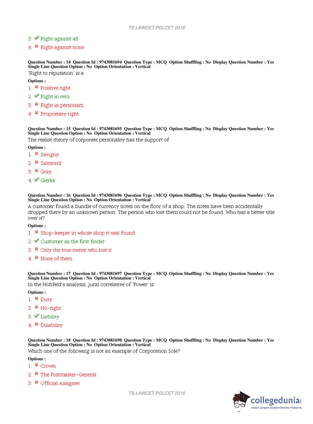 TS PGLCET 2018 LLM Question Paper with Answer Key PDFs Shift 1