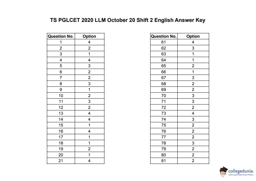 | TS PGLCET 2020 LLM Question Paper PDF | TS PGLCET 2020 LLM Answer Key PDF |