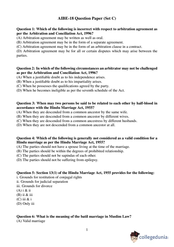 AIBE 18 Question Paper (Set C) with Answer key and Solution PDF is available to download here. AIBE 18 was successfully conducted by Bar Council of India (BCI) on December 10, 2023. The question paper comprised a total of 100 questions.