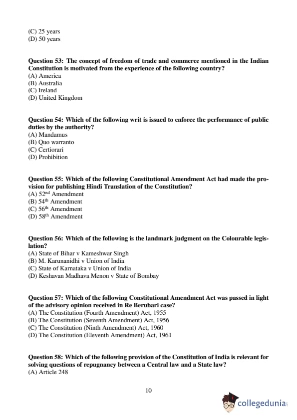 | 55.Which of the following Constitutional Amendment Acts had made the provision for publishing Hindi Translation of the Constitution? (A) 52nd Amendment (B) 54th Amendment (C) 56th Amendment (D) 58th Amendment |