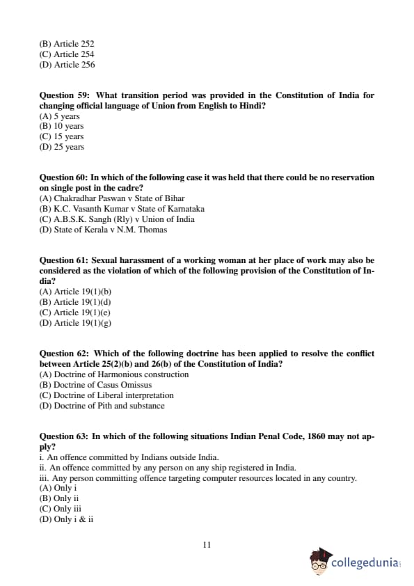 | 62.Which of the following doctrines has been applied to resolve the conflict between Article 25(2)(b) and 26(b) of the Constitution of India? (A) Doctrine of Harmonious construction (B) Doctrine of Casus Omissus (C) Doctrine of Liberal interpretation (D) Doctrine of Pith and substance |