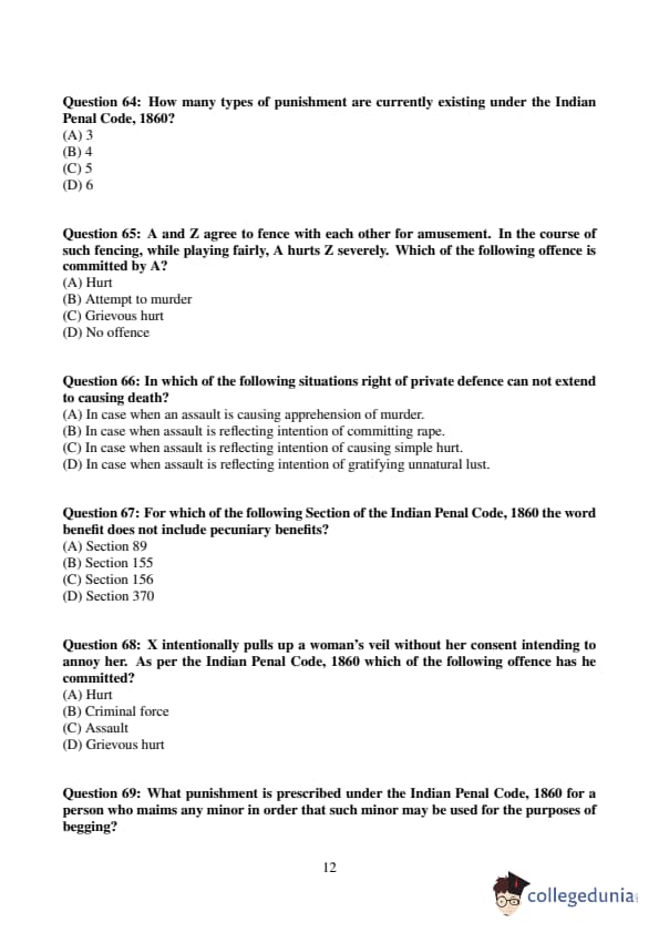 | 64.How many types of punishment are currently existing under the Indian Penal Code, 1860? (A) 3 (B) 4 (C) 5 (D) 6 |