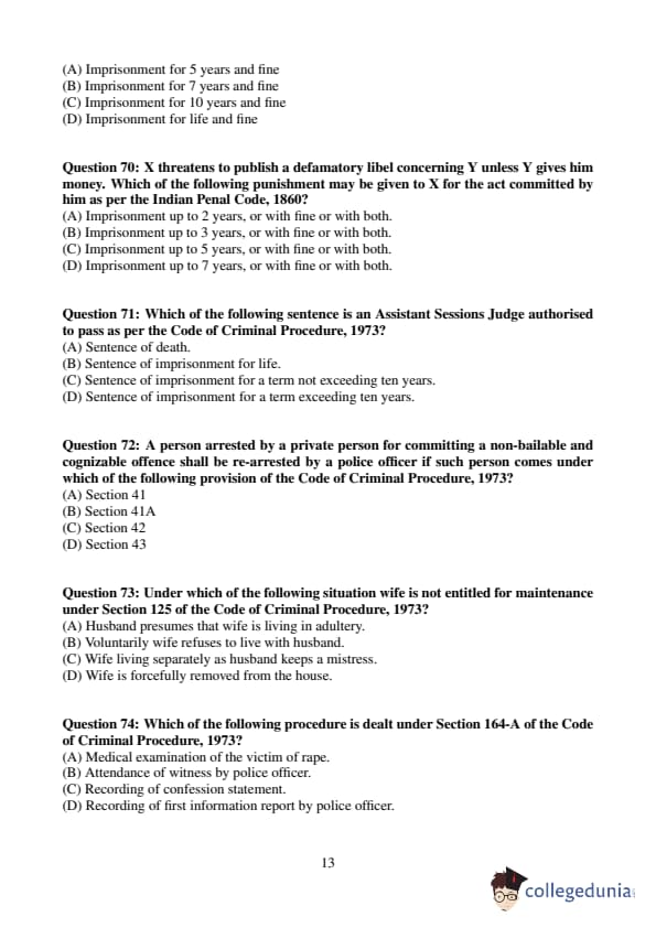 | 71.Which of the following sentences is an Assistant Sessions Judge authorised to pass as per the Code of Criminal Procedure, 1973? (A) Sentence of death. (B) Sentence of imprisonment for life. (C) Sentence of imprisonment for a term not exceeding ten years. (D) Sentence of imprisonment for a term exceeding ten years. |