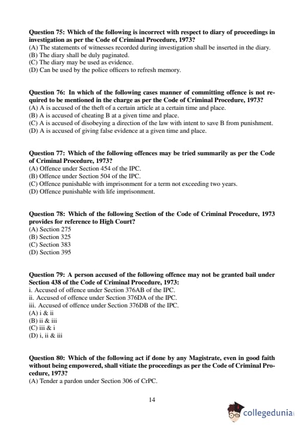 | 79.A person accused of the following offence may not be granted bail under Section 438 of the Code of Criminal Procedure, 1973: i. Accused of offence under Section 376AB of the IPC. ii. Accused of offence under Section 376DA of the IPC. iii. Accused of offence under Section 376DB of the IPC. (A) i & ii (B) ii & iii (C) iii & i (D) i, ii & iii |