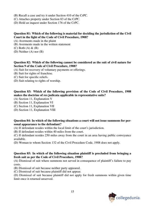 | 81.Which of the following is material for deciding the jurisdiction of the Civil Court in the light of the Code of Civil Procedure, 1908? (A) Averments made in the plaint (B) Averments made in the written statement (C) Both (A) & (B) (D) Neither (A) nor (B) |