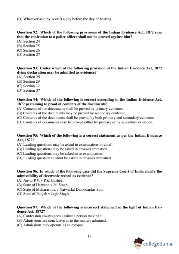 | 92.Which of the following provisions of the Indian Evidence Act, 1872 says that the confession to a police officer shall not be proved against him? (A) Section 24 (B) Section 25 (C) Section 26 (D) Section 27 |