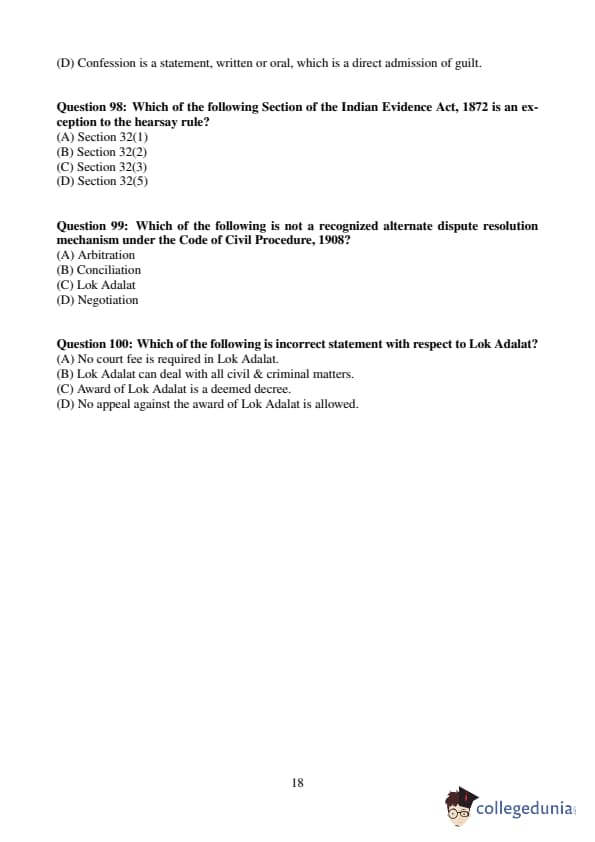 | 99.Which of the following is not a recognized alternate dispute resolution mechanism under the Code of Civil Procedure, 1908? (A) Arbitration (B) Conciliation (C) Lok Adalat (D) Negotiation |