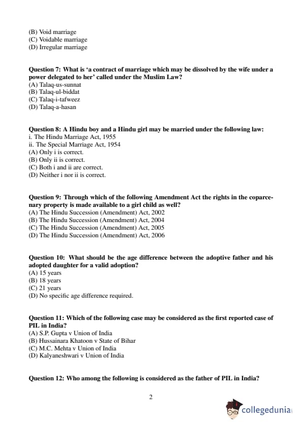 | 9.Through which of the following Amendment Act the rights in the coparcenary property is made available to a girl child as well? (A) The Hindu Succession (Amendment) Act, 2002 (B) The Hindu Succession (Amendment) Act, 2004 (C) The Hindu Succession (Amendment) Act, 2005 (D) The Hindu Succession (Amendment) Act, 2006 |