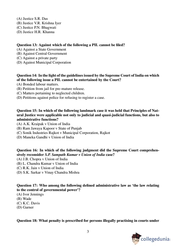 | 12.Who among the following is considered as the father of PIL in India? (A) Justice S.R. Das (B) Justice V.R. Krishna Iyer (C) Justice P.N. Bhagwati (D) Justice H.R. Khanna |
