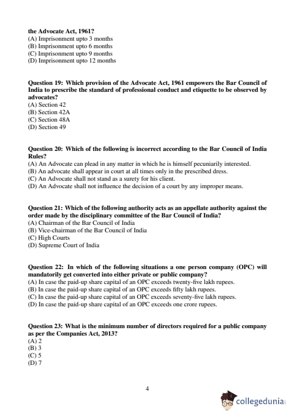 | 18.What penalty is prescribed for persons illegally practicing in courts under the Advocate Act, 1961? (A) Imprisonment up to 3 months (B) Imprisonment up to 6 months (C) Imprisonment up to 9 months (D) Imprisonment up to 12 months |