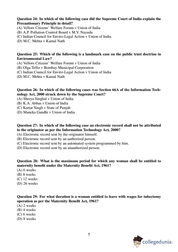 | 24.In which of the following case did the Supreme Court of India explain the Precautionary Principle in detail? (A) Vellore Citizens’ Welfare Forum v Union of India (B) A.P. Pollution Control Board v M.V. Nayudu (C) Indian Council for Enviro-Legal Action v Union of India (D) M.C. Mehta v Kamal Nath |